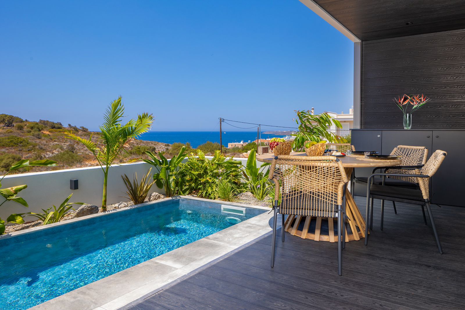 Η Phy~Sea Villa Crete βρίσκεται στον Καλαθά Χανίων και διατίθεται προς ενοικίαση. Είναι ένας σύγχρονος χώρος διαμονής, ιδανικός για χαλάρωση και άνεση. Η κατασκευή της βίλας και ο αύλειος χώρος έχουν δημιουργηθεί με πολύ μοντέρνα αισθητική, προσφέροντας μια χαλαρωτική ατμόσφαιρα για τους επισκέπτες. Ο αύλειος χώρος περιλαμβάνει μια υπέροχη πισίνα περιτριγυρισμένη από άνετες ξαπλώστρες και μαξιλάρες. Υπάρχει επίσης ένας υπαίθριος χώρος τραπεζαρίας, όπου οι επισκέπτες μπορούν να απολαύσουν τα γεύματά τους υπό τη σκιά μιας μοντέρνας πέργκολας. Ο χώρος είναι διακοσμημένος με φυτά και φαναράκια που προσθέτουν μια ιδιαίτερη ατμόσφαιρα. Επιπλέον, η βίλα προσφέρει θέα στη θάλασσα, καθιστώντας την ιδανική για ξεκούραστες διακοπές.
